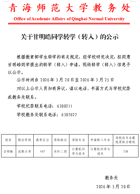 关于甘明皓同学转学(转入)的公示