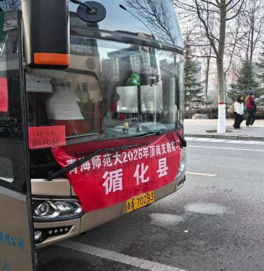 2026 年顶岗支教实习——循化县 ”的红色横幅在晨光中格外醒目。从西宁到循化,沿途的高原风光徐徐铺展,车厢里充满了对支教生活的期待与憧憬:有人轻声交流教学设想,有人翻阅教材梳理思路,有人用镜头记录下奔赴基层的珍贵瞬间。