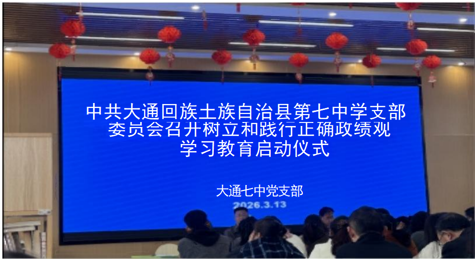 简凝心铸魂强信念,笃行实干育新人。2026年3月13日,中共大通回族土族自治县第七中学支部委员会隆重召开树立和践行正确政绩观学习教育启动仪式, 学校全体教职工齐聚一堂,现场氛围庄重而热烈,鲜红的灯笼点缀会场更添奋进 气息,青海师范大学的支教教师们也积极参与其中,与一线教育工作者共同接受 思想的淬炼与洗礼。